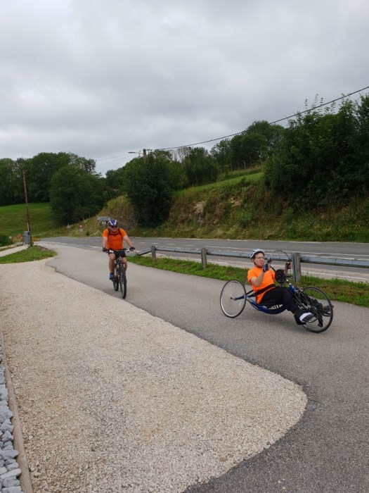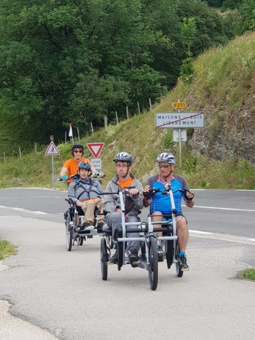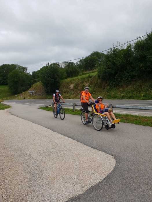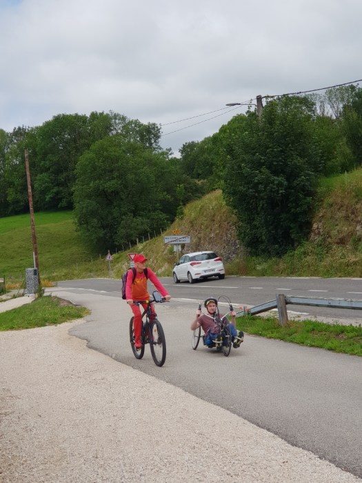 Les activités à découvrir étaient nombreuses, Mathieu a choisi de découvrir une joëlette à assistance ainsi que le cimgo, tandis que Julien après avoir grimpé sur le mur d’escalade , dévalé en cimgo et navigué en windkart sur le lac de Vouglan, a fortement apprécié l’assistance électrique du handbike VTT de Handbike Nature.