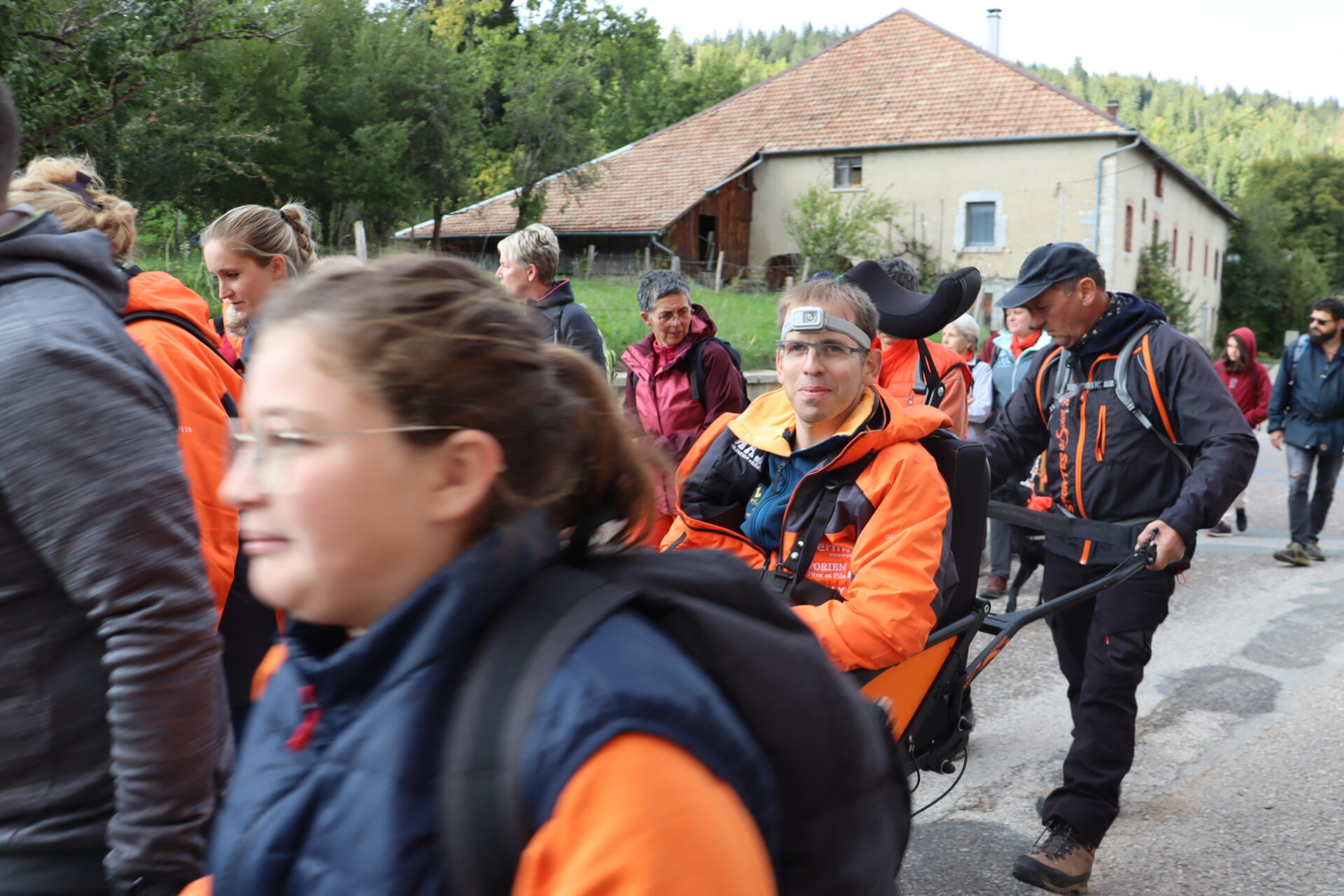 Au lendemain de la marche étoilée, une équipe Elan s’est présentée au départ à Oye et Pallet pour rejoindre Pontarlier avec une joëlette. Terrain très bourbeux et très glissant dans les montées pentues, mais nous avions une équipe de choc qui n’a pas perdu sa motivation . Un grand merci au DSA ( Doubs Sud Athlétisme ) qui nous donnait une participation de 1 euro par coureur ou marcheur inscrit . Nous avons pû bénéficier d’un don de 700 euros.